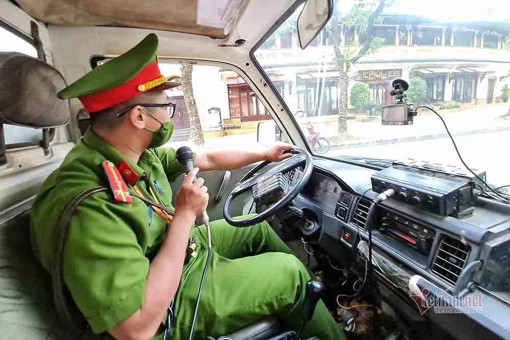 Dọc đường tuần tra, anh Hoàng liên tục dùng loa phóng thanh nhắc nhở các trường hợp tập trung ở nơi công cộng.