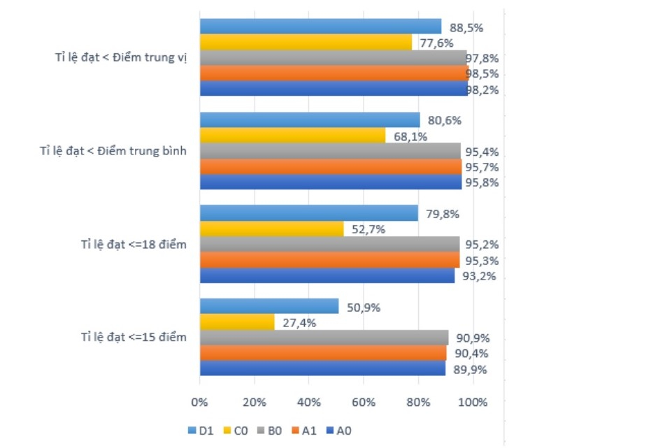 Nhất là ở các khối A0, A1 và B0 thì các mức điểm đại đa số là rất thấp, thấp hơn mức điểm trung vị, điểm trung bình và thấp hơn 15 điểm/tổ hợp.