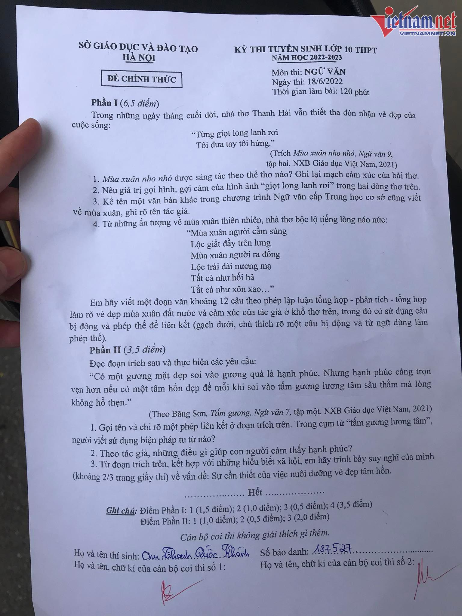 Về phía giáo viên, chia sẻ với VietNamNet, cô Phùng Thu Hằng, Tổ trưởng Tổ Văn - Sử của Trường THCS Thái Thịnh đánh giá đề thi tương đối vừa sức và vẫn có câu hỏi phân hóa, học sinh vẫn có thể phát huy phẩm chất, năng lực của mình.