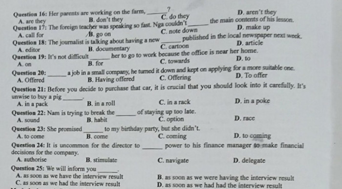 Tuy nhiên, người tạo ra các cartoon được gọi là “cartoonist” chứ không phải là “journalist”. Bởi, theo từ điển, journalist là những người viết các mẩu truyện ngắn, bài báo trên các báo, tạp chí. Vì vậy, xét về nghĩa, câu này chọn D - article là phù hợp nhất.