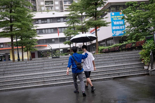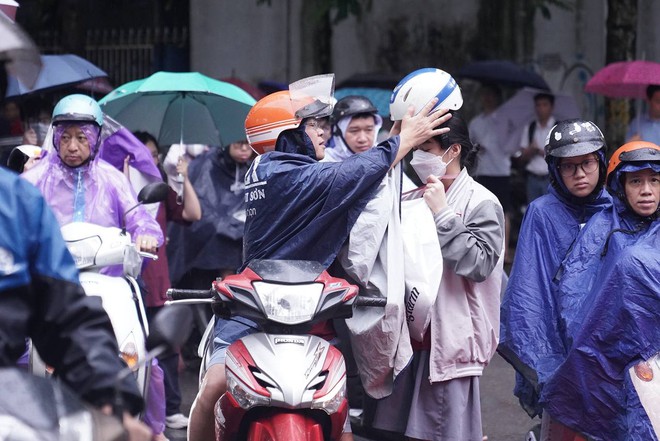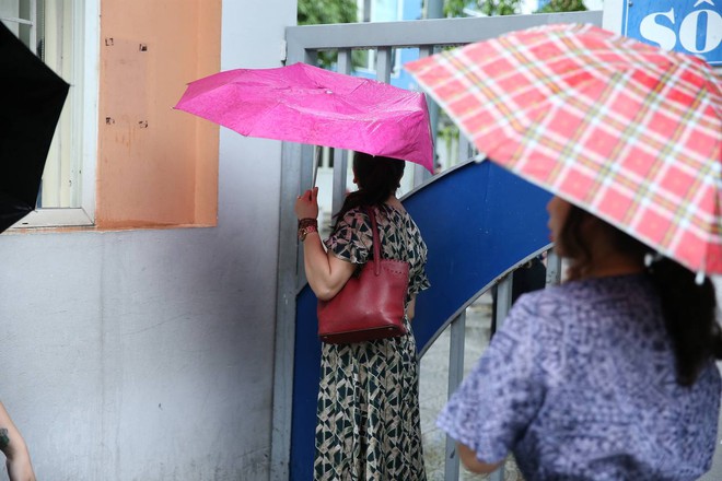 Tại điểm thi trường THCS Trần Duy Hưng, không khí hối hả trước giờ G cũng hiển hiện rõ nét. Nhiều bậc phụ huynh sau khi đưa con em đến không về ngay mà "đội mưa" nán lại chờ đợi.