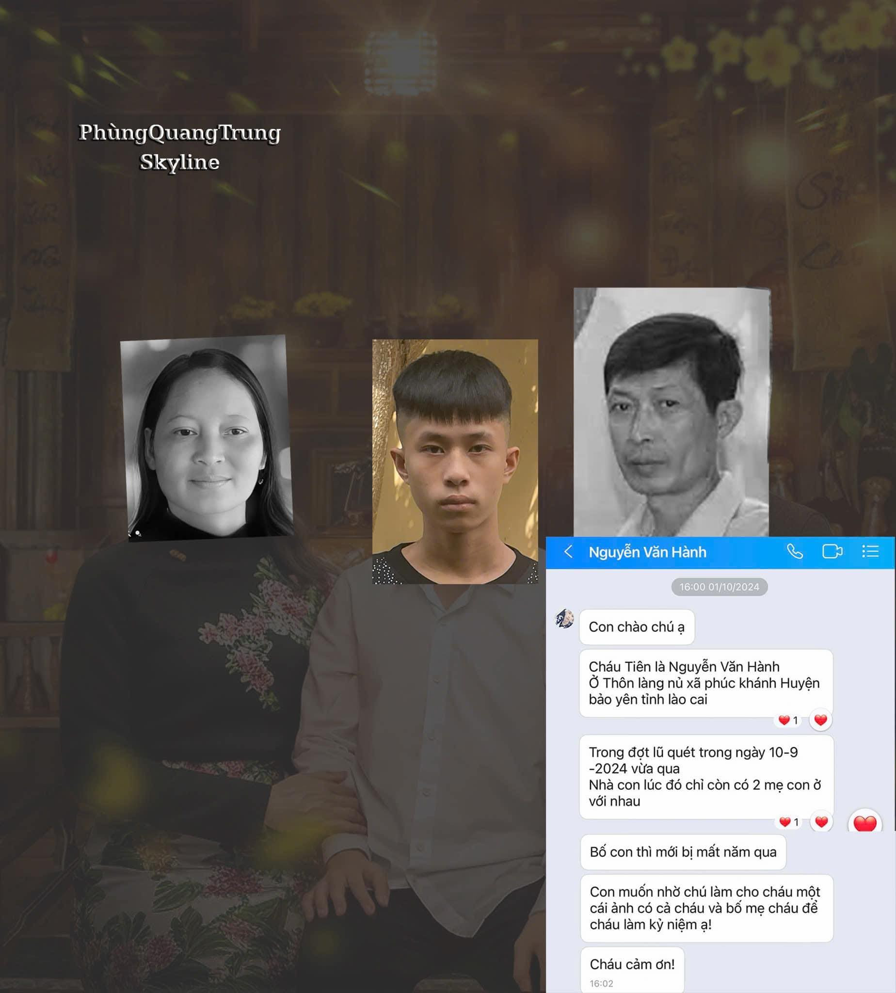 2 ngày trước, theo gợi ý của cô giáo chủ nhiệm, Hành đã liên hệ với anh Phùng Quang Trung (29 tuổi) – người thực hiện dự án “Skyline – Nét ảnh vượt bão”, phục dựng những bức ảnh tưởng niệm nạn nhân xấu số tại thôn Làng Nủ.