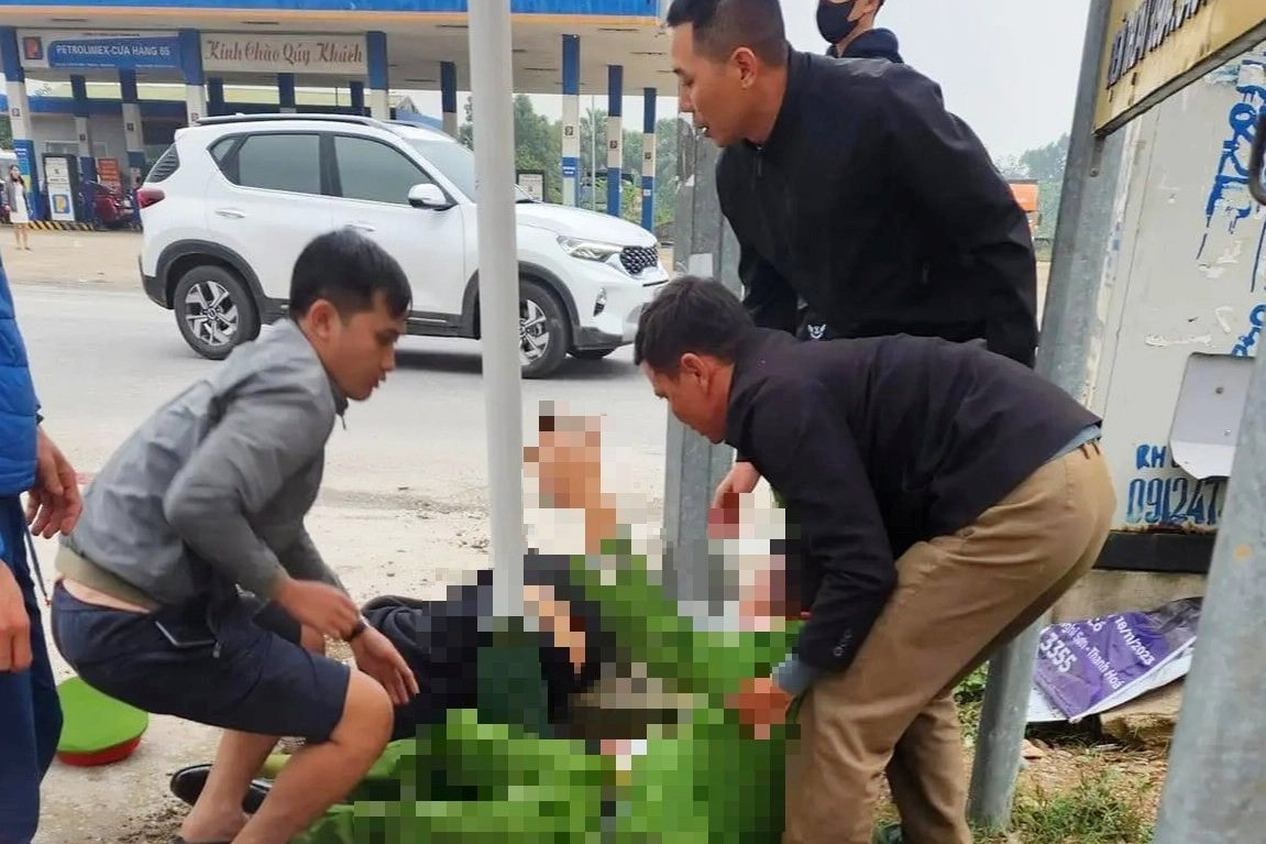 Cú tông mạnh khiến 2 người cùng xe máy trượt ngã và văng vào người thiếu tá N.T.T.(SN 1985) - cán bộ công an xã Hải Yến, thị xã Nghi Sơn đang đứng bên đường làm nhiệm vụ đảm bảo an ninh trật tự.