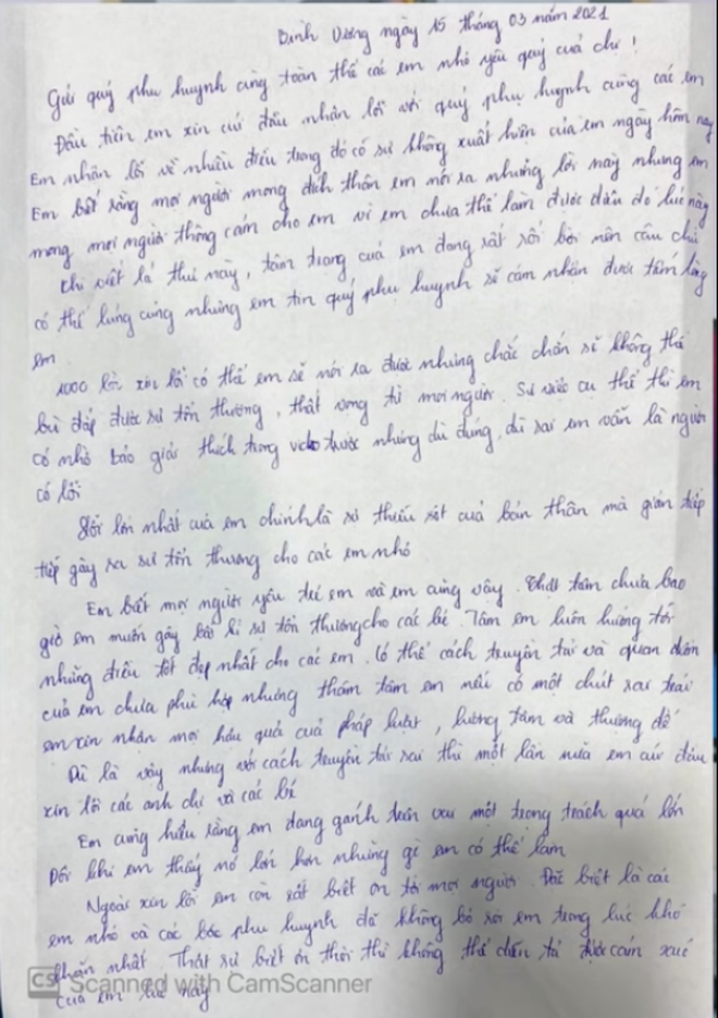 "1.000 lời xin lỗi em có thể nói ra được nhưng không thể bù đắp lại sự tổn thương, thất vọng từ mọi người. Sự việc cụ thể em có nhờ Bảo giải thích ở video trước nhưng dù đúng dù sai thì em vẫn là người có lỗi. Lỗi lớn nhất của em là vì sự thiếu sót của bản thân đã gián tiếp gây ra tổn thương cho các em nhỏ... Thật tâm em không muốn gây ra tổn thương nào cho các bé, tâm em luôn hướng tới những điều tốt nhất cho các em. Có thể cách truyền tải và quan điểm của em chưa phù hợp nhưng thâm tâm em nếu có một chút sai trái em xin nhận hậu quả của pháp luật. Dù là vậy nhưng cách truyền tải sai thì một lần nữa em xin lỗi anh chị và các bé.
