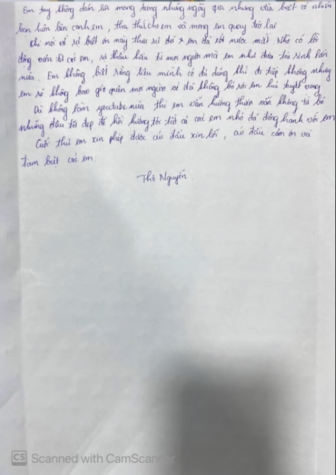 ... Em tuy không dám lên mạng những ngày qua nhưng em biết có những bạn vẫn luôn bên cạnh em, tha thứ cho em và mong em quay trở lại. Khi nói về sự biết ơn này, em đã rớt nước mắt. Nhờ có sự động viên từ các em, sự thấu hiểu từ mọi người mà em như được tái sinh thêm lần nữa... Dù không làm YouTube nữa nhưng em vẫn sẽ hướng thiện, vẫn không từ bỏ những điều tốt đẹp để hồi hướng đến tất cả các em nhỏ đã đồng hành cùng với em. Cuối thư em xin phép được cúi đầu xin lỗi, cúi đầu cảm ơn và tạm biệt các em".
