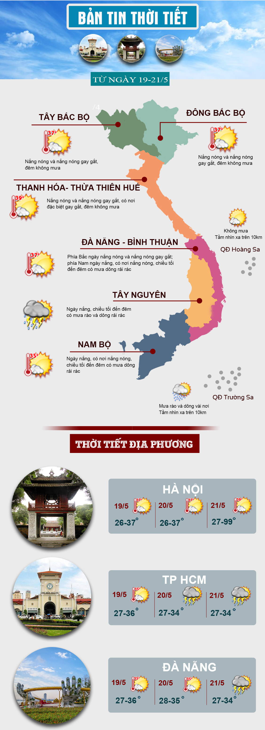 Sang 20/5, nhiệt độ Bắc Bộ lại tăng lên với mức cao nhất 36-38, có nơi trên 39 độ, thời gian nắng nóng tập trung vào khoảng 11-17h. Khu vực từ Thanh Hóa đến Phú Yên cũng tăng lên 37-40 độ, có nơi trên 40, thời gian nắng nóng kéo dài hơn từ 10-18h.
