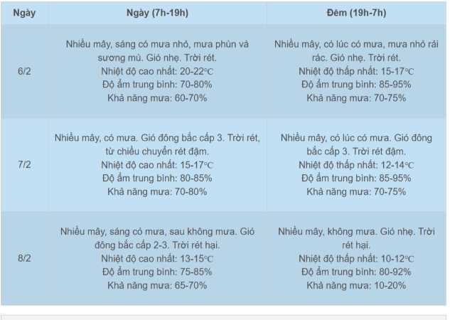 Cụ thể, trong 3 ngày này, khu vực thủ đô Hà Nội nhiều mây, có mưa rải rác. Hôm nay (6/2) trời rét với nhiệt độ cao nhất ban ngày dao động khoảng 20-22℃, thấp nhất ban đêm 15-17℃.