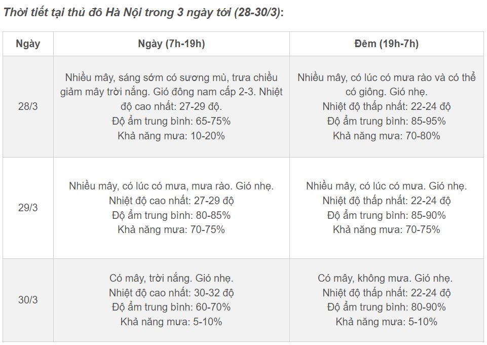 28/03/2024 15:44Thời tiết Hà Nội 3 ngày tới: Đón không khí lạnh yếu trước khi nắng nóng mạnh
