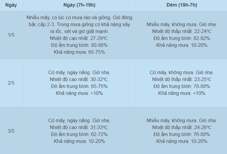 Theo Trung tâm Dự báo khí tượng thủy văn quốc gia, thời tiết Hà Nội 3 ngày tới (1/5-3/5), do ảnh hưởng của không khí lạnh nén rãnh áp thấp nên trời mưa giông, gió đông bắc cấp 2-3, dịu mát; nhưng 2 ngày sau trời không mưa, tăng nhiệt nhanh.