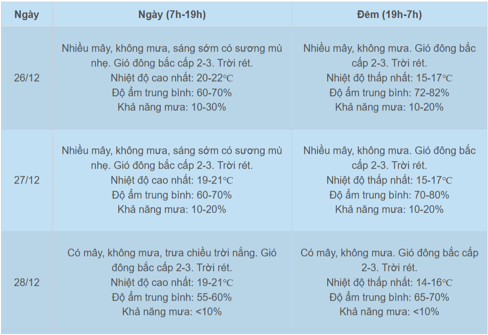 Theo Trung tâm dự báo khí tượng thủy văn quốc gia, thời tiết Hà Nội 3 ngày tới (26-28/12), tuy không khí lạnh tăng cường liên tiếp nhưng nền nhiệt ban ngày vẫn ở ngưỡng 19-22 độ; chủ yếu trời chỉ rét về đêm và sáng sớm.
