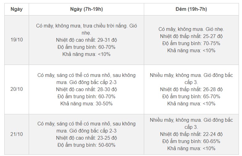 Cụ thể về thời tiết tại thủ đô Hà Nội trong 3 ngày (19-21/10):