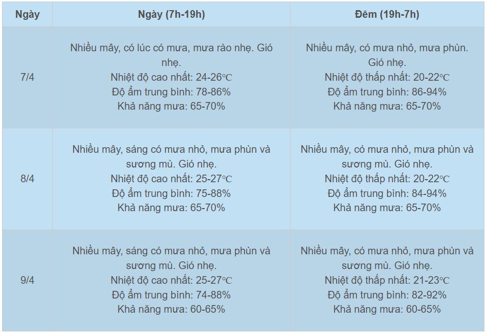Theo Trung tâm Dự báo khí tượng thủy văn quốc gia, thời tiết Hà Nội 3 ngày tới (7/4-9/4), do ảnh hưởng không khí lạnh yếu, lệch đông nên xuất hiện mưa rào, sau chuyển mưa phùn, sương mù, nồm ẩm; nền nhiệt về cơ bản ít thay đổi.