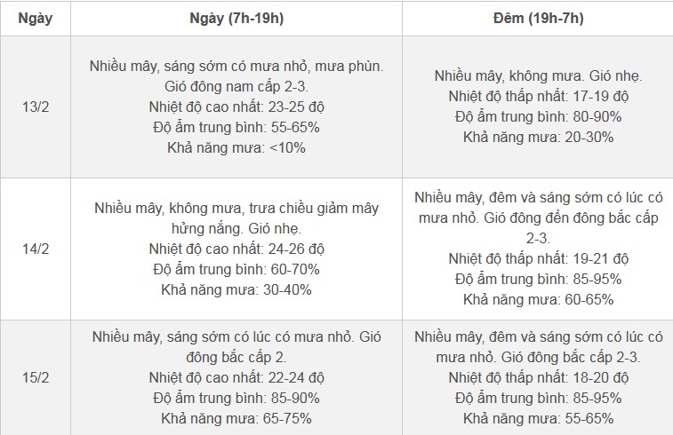 Thời tiết tại thủ đô Hà Nội trong 3 ngày tới (13-15/2)