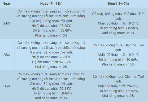 Do đó, từ 24-26/3, khu vực thủ đô Hà Nội có mây, không mưa, sáng sớm có sương mù và sương mù nhẹ rải rác, trưa chiều trời nắng.