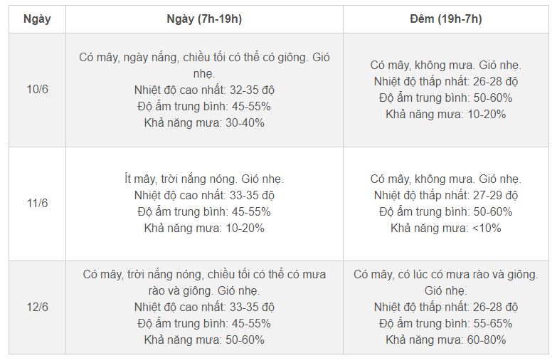 Cụ thể về thời tiết tại thủ đô Hà Nội trong 3 ngày (10-12/6):