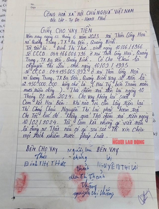 Trình bày với phóng viên, bà Đinh Thị Thức (58 tuổi; ở thôn Công Hòa, xã Quảng Trung) cho biết lấy lý do cần vay tiền cho em gái mình đi xuất khẩu lao động ở Úc, Nguyễn Thị Lài đã vay của bà Thức tổng cộng 4 lần với tổng số tiền hơn 2,4 tỉ đồng - qua hình thức viết giấy cho vay tiền (ký, điểm chỉ và người làm chứng) vào ngày 12-6-2023.