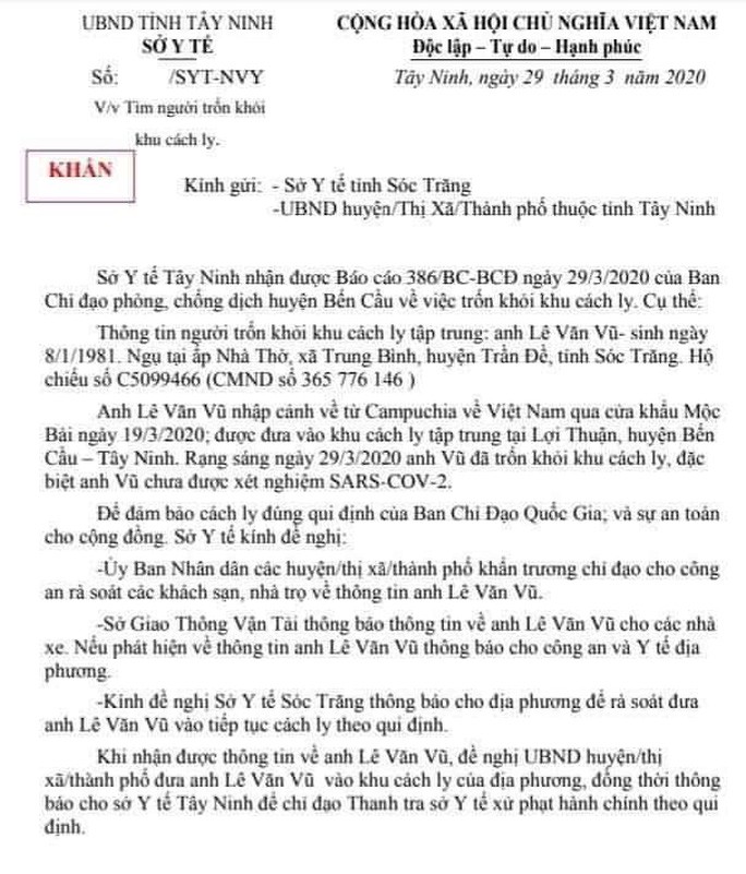 "Khi nhận được thông tin về Lê Văn Vũ, đề nghị UBND huyện/ thị xã/ thành phố đưa anh này vào khu cách ly của địa phương, đồng thời thông báo cho sở Y tế tỉnh Tây Ninh để chỉ đạo Thanh tra sở xử phạt hành chính theo qui định" - văn bản của Sở Y tế tỉnh Tây Ninh nêu rõ.
