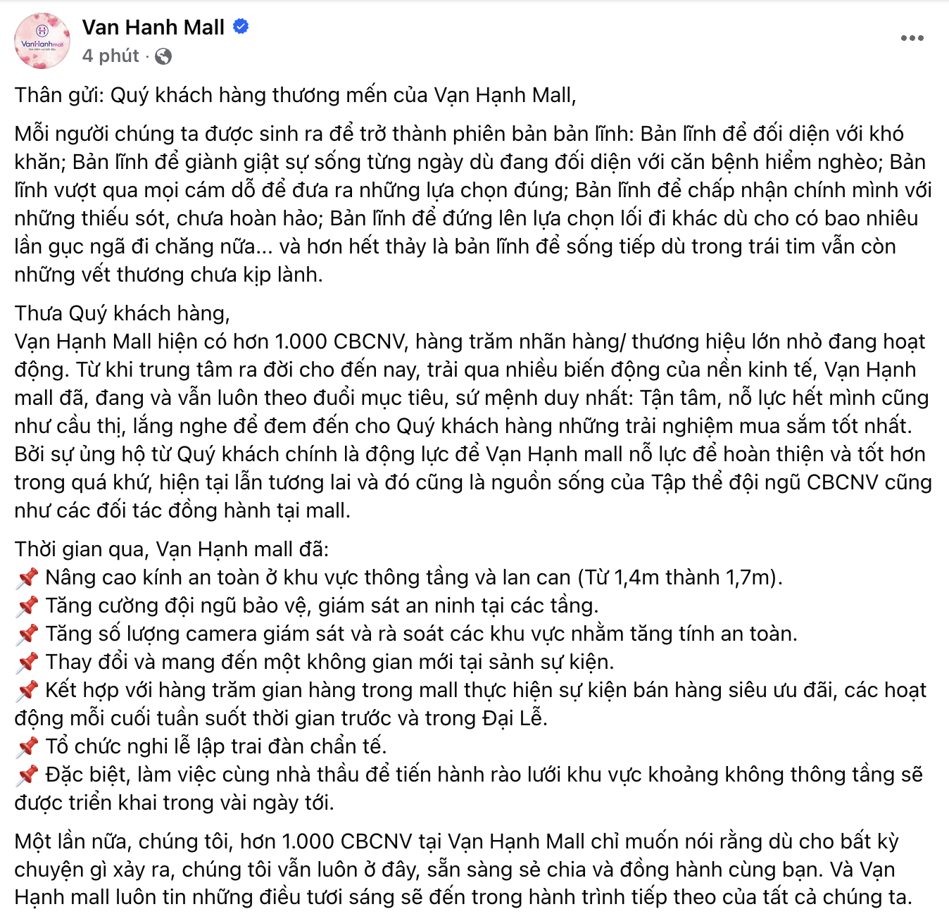 Một lần nữa, chúng tôi, hơn 1.000 cán bộ công nhân viên tại Vạn Hạnh Mall chỉ muốn nói rằng dù cho bất kỳ chuyện gì xảy ra, chúng tôi vẫn luôn ở đây, sẵn sàng sẻ chia và đồng hành cùng bạn. Và Vạn Hạnh mall luôn tin những điều tươi sáng sẽ đến trong hành trình tiếp theo của tất cả chúng ta.