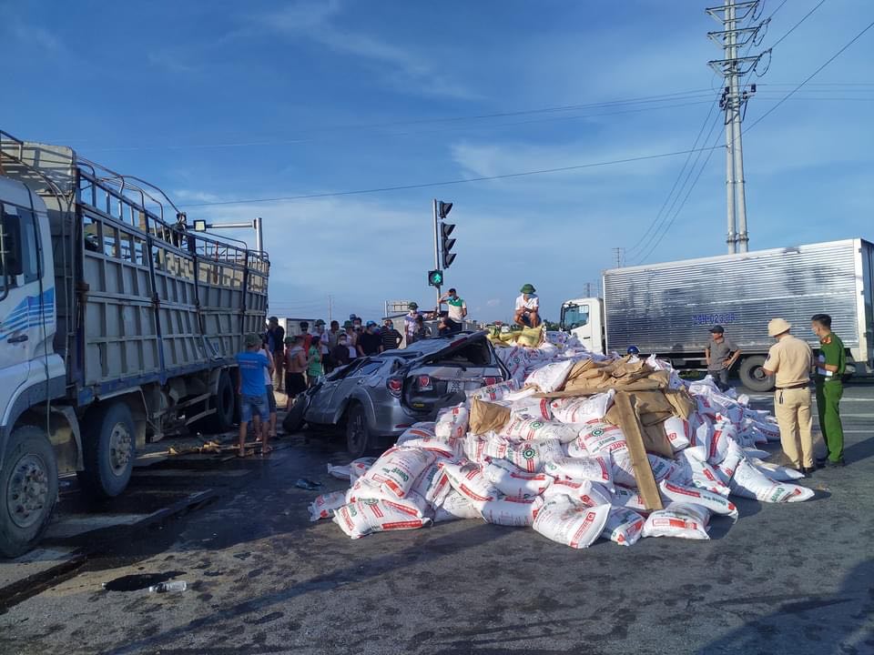 Sau va chạm, xe tải chở cám đổ, đè lên cabin của ô tô con. Hàng hóa trên xe tải cũng văng trúng một người đi xe máy.