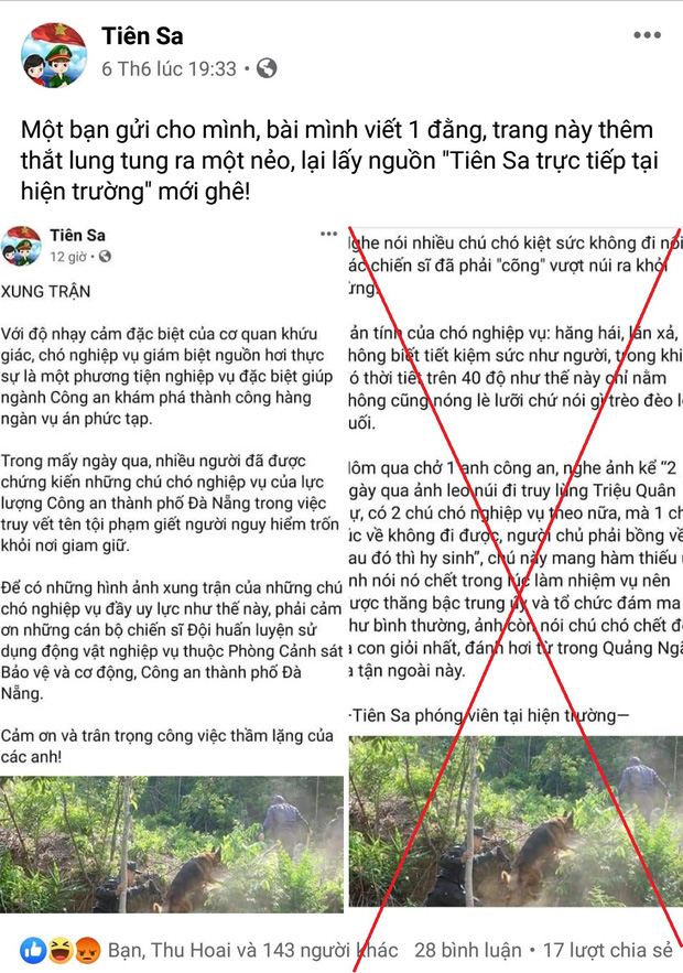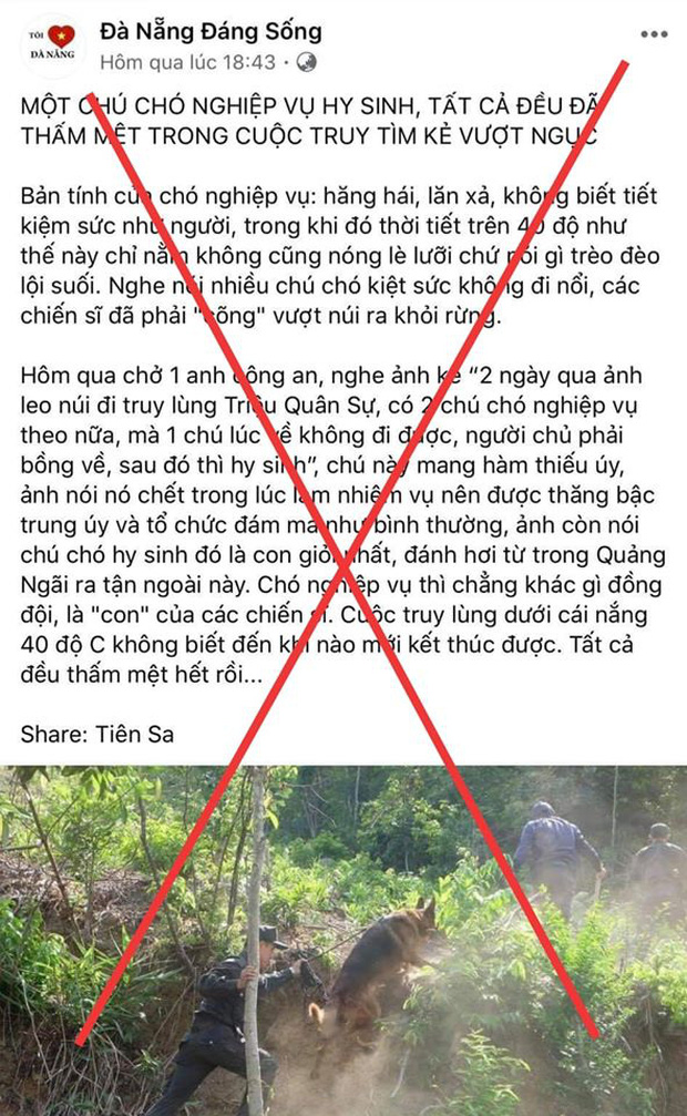 Trước đó, một trang fanpage lớn có gần 5 triệu người theo dõi bất ngờ đăng tải 1 bài viết với nội dung nói về việc một chú chó nghiệp vụ mang hàm thiếu úy đã hy sinh trong lúc truy tìm tội phạm trốn trại ở Đà Nẵng. Bên dưới bài viết, trang Fanpage này ghi nguồn là: "Tiên Sa phóng viên tại hiện trường". Đáng nói, dù chưa được kiểm chứng nhưng bài viết này đã được rất nhiều Fanpage và trang tin khác sao chép và đăng tải lại, thu hút hàng triệu lượt like và bình luận.