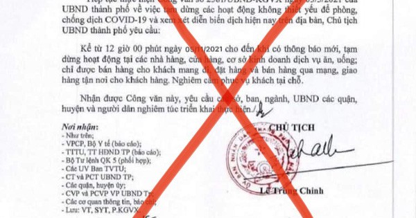 Văn bản giả có nội dung, "kể từ ngày 5-11 tạm dừng hoạt động tại các nhà hàng, cửa hàng, cơ sở kinh doanh dịch vụ ăn uống; chỉ bán hàng cho khách mang đi, bán qua mạng".