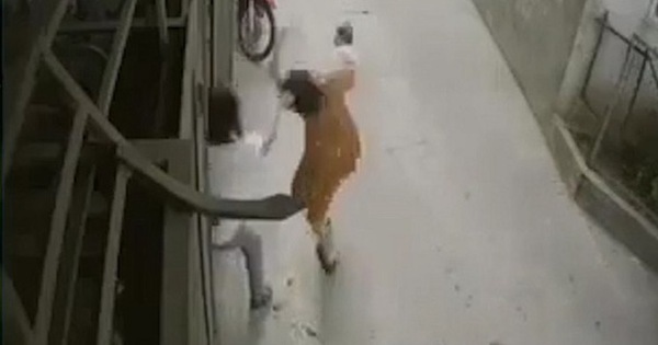 Người chồng túm tóc vợ đang bế con nhỏ kéo ngã xuống đất khiến hai mẹ con bị thương. Ảnh cắt từ clip