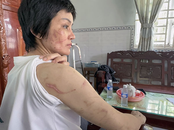 “Lúc sau, tôi vay mượn không được thì bị chồng đánh đập rất dã man. Lúc đầu, anh ấy trói tay chân tôi lại, nhét giẻ vào miệng, dùng dây nồi cơm điện, thắt lưng đánh vào lưng, tay; dùng cục sắt đánh vào hai đầu gối, chân. Dần về sau, anh L. nướng cho cọng kẽm nóng rồi dí lên mặt tôi…”, chị G. kế lại.