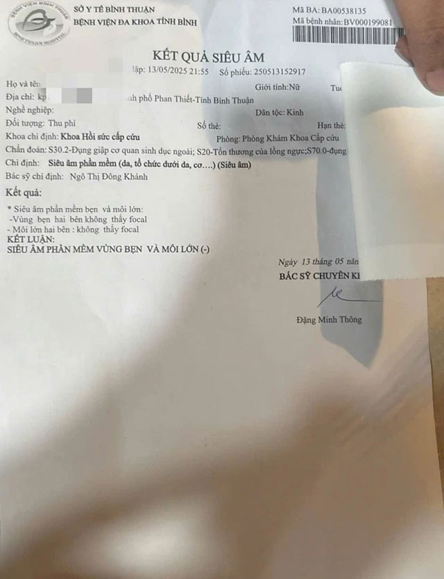 Chị L nghi ngờ con gái bị bạo hành nên đã đến Công an phường Mũi Né trình báo. Bé A sau đó được đưa đến Bệnh viện Đa khoa tỉnh Bình Thuận để khám, chẩn đoán ban đầu là: Đụng dập cơ quan sinh dục ngoài, tổn thương lồng ngực.