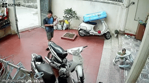 May mắn, lúc này người cha vừa bấm điện thoại vừa đang đi từ cổng vào đã nghe thấy tiếng động và vội vàng lao đến đỡ lấy đầu em bé để khỏi bị va đập xuống sân.