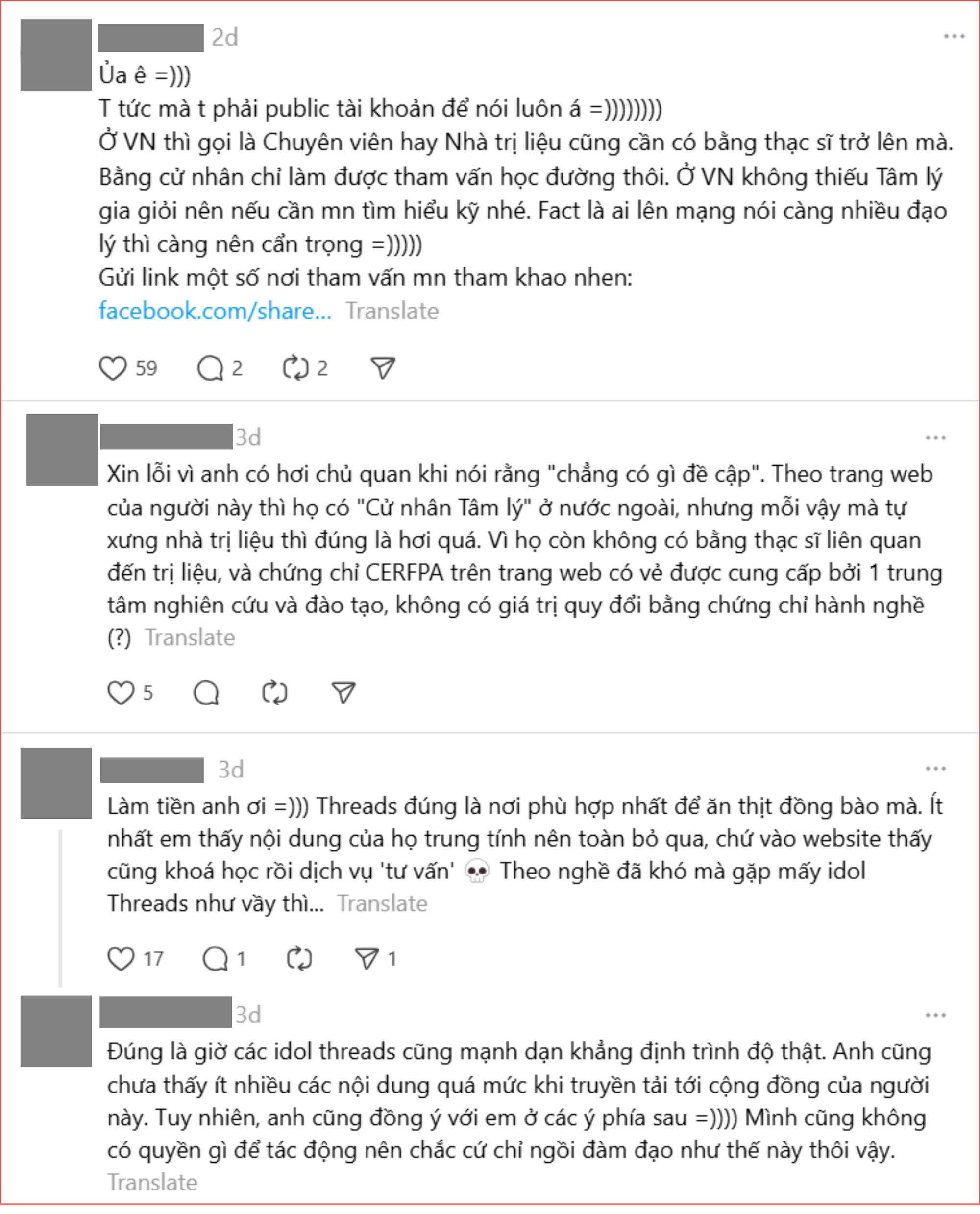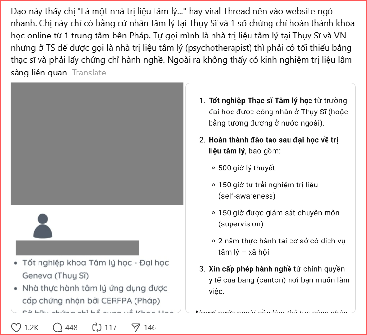 Ban đầu là sự tò mò, tiếp đó là cảm giác khó chịu vì bắt gặp lời thậm xưng này quá nhiều lần khi lướt newfeed, dân mạng bắt đầu tìm hiểu "nhà trị liệu tâm lý" này, và tất cả đều phải đặt ra những câu hỏi về vấn đề bằng cấp, chứng chỉ hành nghề của người tự nhận mình là nhà trị liệu tâm lý.