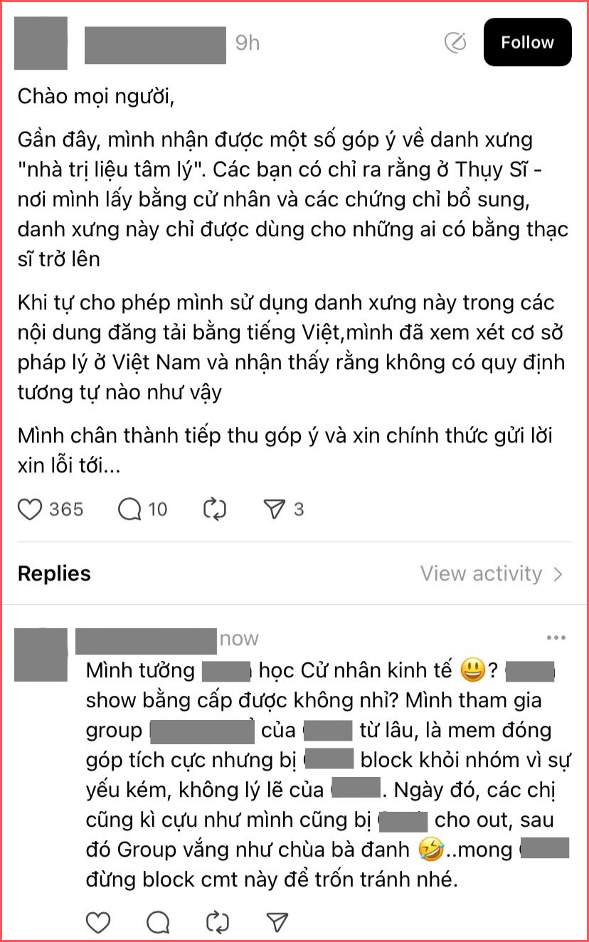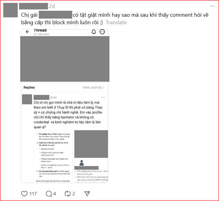 Dù nhận mình là "nhà trị liệu tâm lý" nhưng người này lại không chứng minh được việc bản thân có đủ bằng cấp, đủ điều kiện để hành nghề tham vấn tâm lý. Khi hỏi hỏi về vấn đề này, nhiều người cho biết đã bị "nhà trị liệu tâm lý" này block.