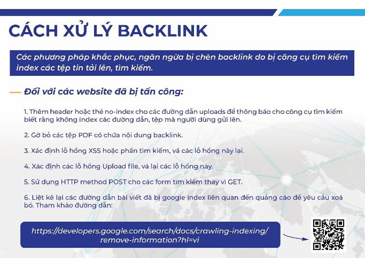 Ngoài ra, website đều sẽ bị Google đánh giá thấp và không được hiển thị trên top tìm kiếm. Các đơn vị chủ quản đã xử lý thành công vẫn có nguy cơ bị chèn backlink trở lại, thường do chưa phát hiện hết hoặc chưa khắc phục hết các lỗ hổng bảo mật, backdoor (cửa hậu) cho phép tin tặc xâm nhập lại các máy chủ web.