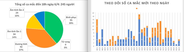 Thời điểm bắt đầu diễn ra cuộc họp Thường trực Chính phủ về công tác phòng chống dịch COVID-19 chiều 6/4, Việt Nam ghi nhận 241 ca mắc COVID-19, con số này tăng thêm 4 ca lúc 18h, thời điểm kết thúc cuộc họp. Cũng trong ngày, chúng ta có 4 bệnh nhân khỏi bệnh, nâng tổng số ca khỏi bệnh ở nước ta lên 95 ca. 24 bệnh nhân đang điều trị đã âm tính 2 lần.