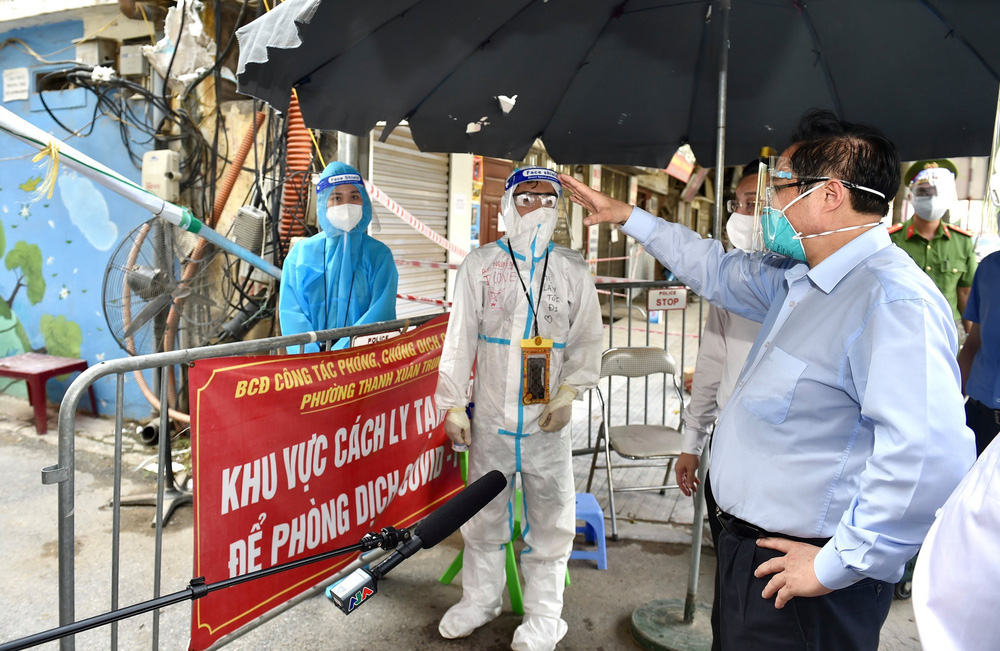 Ngay sau đó, Thủ tướng đến ngõ 328-330 Nguyễn Trãi, nơi đã phát hiện hơn 300 ca mắc Covid-19 trong tổng số hơn 1.800 người dân.