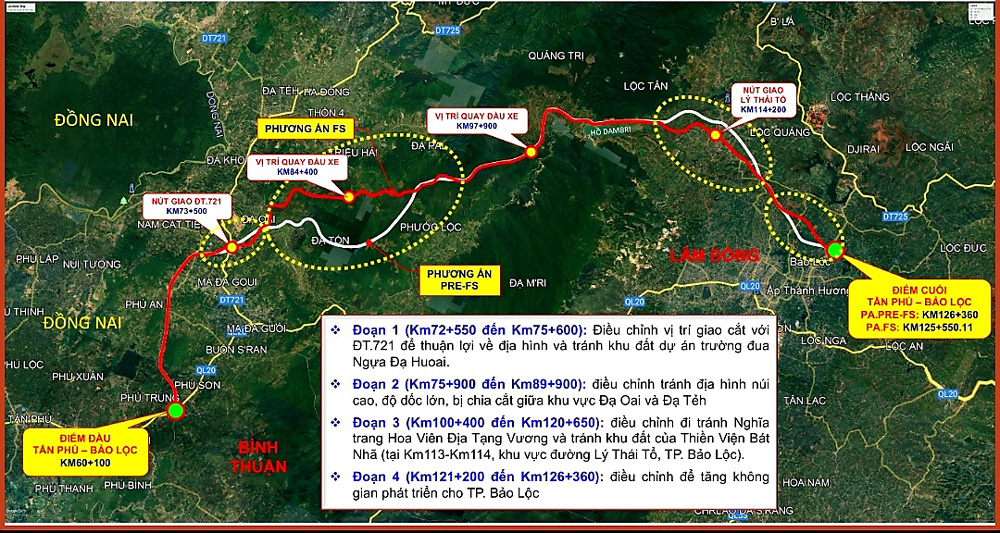 Lý trình dự án đi qua các huyện Tân Phú (Đồng Nai), Đạ Huoai, Bảo Lộc (Lâm Đồng), có điểm đầu kết nối với điểm cuối của dự án thành phần Dầu Giây - Tân Phú thuộc công trình cao tốc Dầu Giây – Liên Khương dài hơn 200 km.