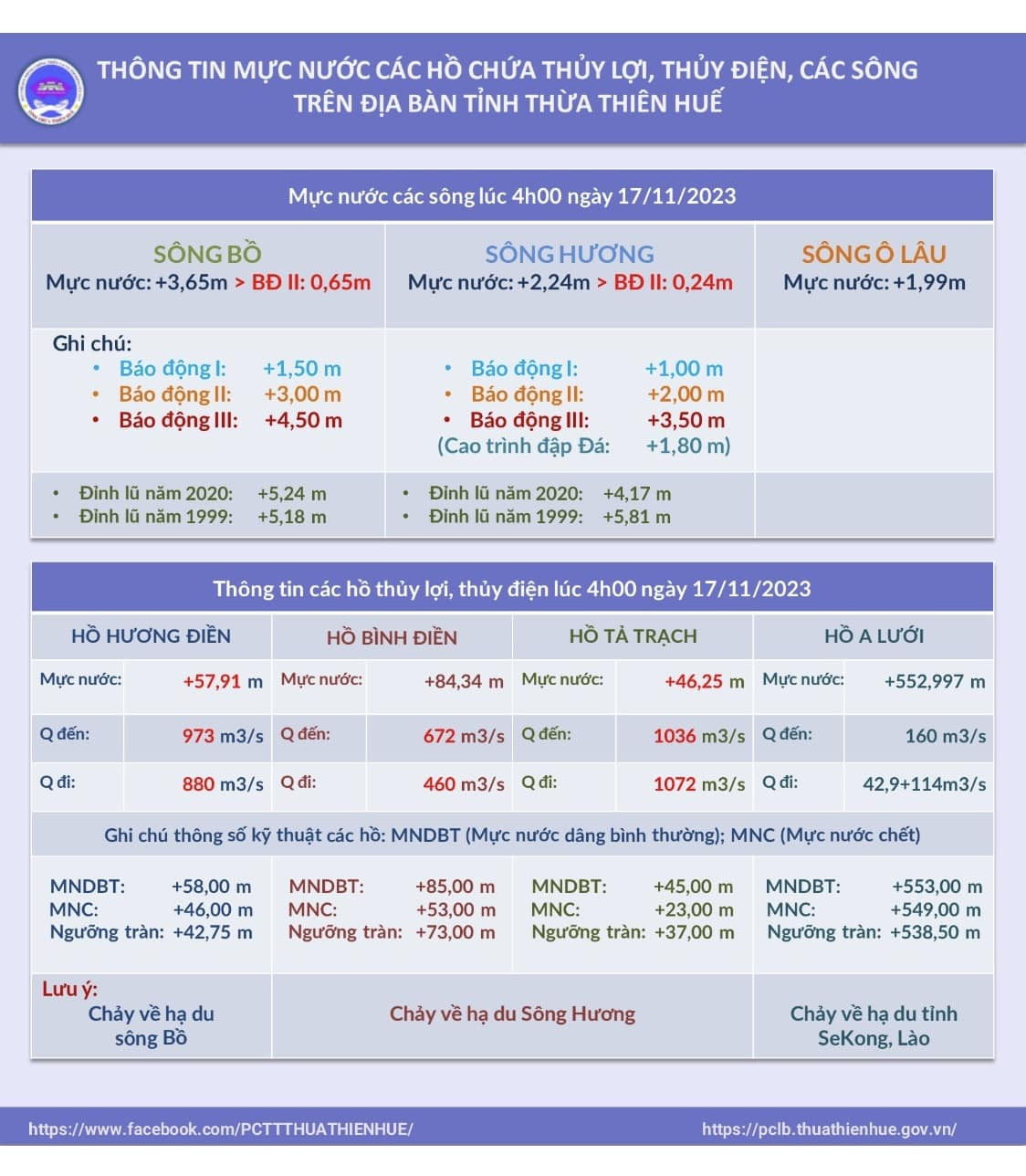 Ngoài ra, theo Đài khí tượng thủy văn tỉnh Thừa Thiên Huế, ngày và đêm 17/11, tại địa phương tiếp tục có mưa, mưa vừa, có nơi mưa to với lượng 30-60mm, có nơi trên 80mm. Từ 18/11, mưa giảm nhanh và kết thúc đợt mưa này. Từ 19/11, không có khả năng xuất hiện mưa lớn trên diện rộng.
