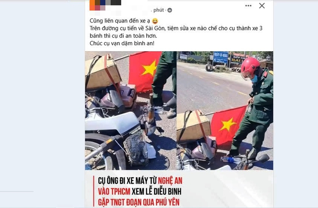 Nhiều video, hình ảnh chia sẻ trên mạng cho thấy cụ ông mặc quân phục, điều khiển xe máy, phía sau phương tiện là lá cờ đỏ sao vàng bay phấp phới.