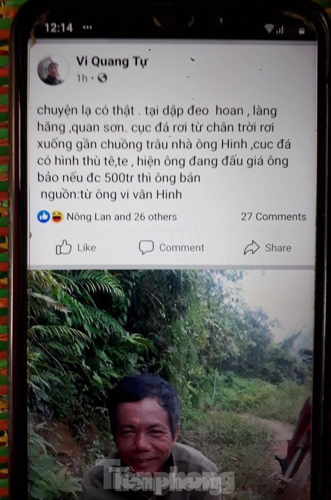 Tại lán nhà ông Vi Văn Hinh ở thôn Làng Hăng, xã Quan Sơn, ông Hinh đưa ra một cục đá màu xanh trắng, dài khoảng 40cm, rộng 25cm. Ông trình bày về nguồn gốc cục đá như sau: “Khoảng 8h ngày 23/6, khi ông Hinh đang ở trong lán thì nghe tiếng cành cây xoan gãy nên ra cửa xem xét thì thấy dưới gốc cây có một hòn đá trồi lên trên mặt đất, xung quanh không có hiện tượng gì khác lạ. Ông Hinh nghĩ rằng, cục đá từ trên trời nên cùng cháu trai ruột là Vy Văn Thoại mang về nhà. Sau đó, ông có nói chuyện này với một vài người và sự việc đã được đồn thổi trên mạng xã hội”.