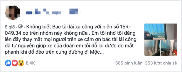 "Tôi đăng lên đây thay mặt cả đoàn cảm ơn bác tài đã tự nguyện giúp xe của đoàn tôi đỗ lại trong lúc đổ đèo mà mất phanh trên cung đường đi Mộc Châu.