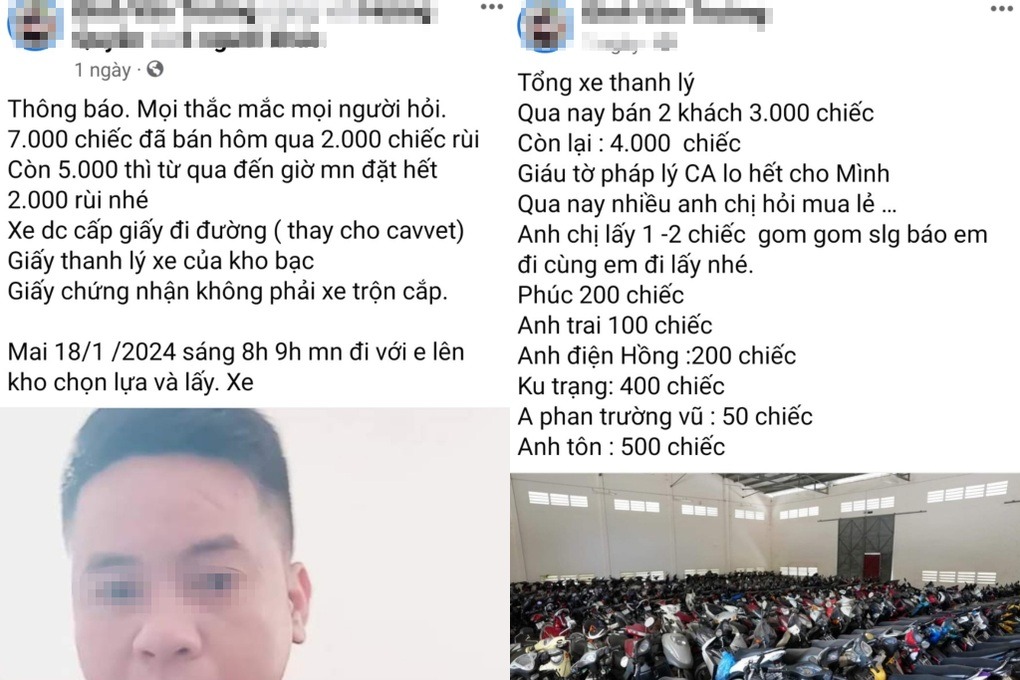 Ở một bài đăng khác, người này thông báo hai ngày qua đã có khách mua 3.000 chiếc xe, còn lại 4.000 chiếc. Khi mua, xe này được công an lo hết giấy tờ pháp lý. Đồng thời, tài khoản này còn đăng tên từng người mua, số lượng từ 50 đến 500 chiếc xe tang vật.