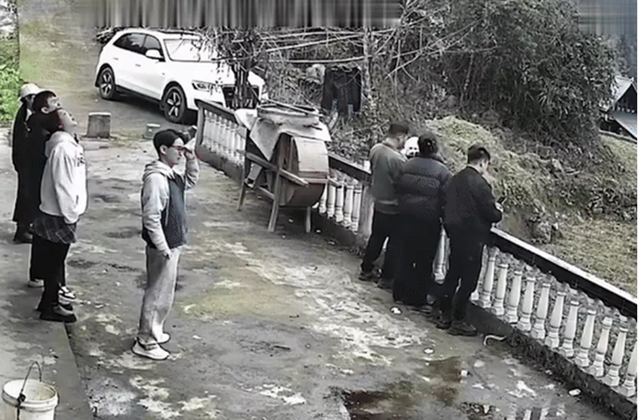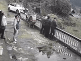 Khi ba người đang vẫy tay chào flycam, nền đất ngay dưới chân bất ngờ sụt lún, khiến cả ba rơi thẳng xuống bên dưới. Một chú chó nhỏ được một nam thanh niên bế trên tay may mắn bám kịp lan can và nhảy về phía trước, thoát nạn trong gang tấc.