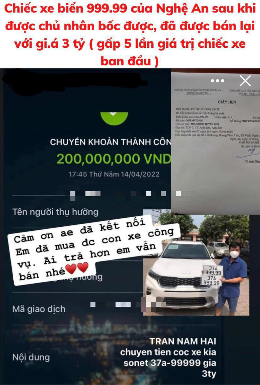 Theo thông tin trên báo Trí Thức Trẻ cho biết, chủ nhân của chiếc xe hiệu KIA Sonet mang biển số 37A-999.99 là anh Trần Hữu T. (SN 1971, trú thị trấn Anh Sơn, huyện Anh Sơn, Nghệ An). Anh T. cho biết sau khi anh bốc được biển số siêu đẹp, từ hôm qua đến nay đã có rất nhiều người gọi điện, nhắn tin hỏi thăm, chúc mừng.