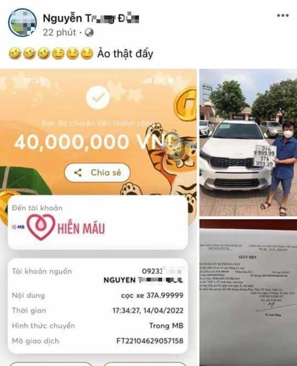 Anh T. cho biết thêm, trong tối 14/4, chủ tài khoản facebook H.H.H. (trú Hà Nội) đã gọi qua facebook cho anh ngỏ ý muốn mua chiếc xe BKS ngũ quý 9 với giá 1,6 tỷ đồng.