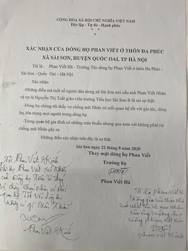 Ông Kính cũng cho biết thêm, trước những lời đồn đại ác ý, vào tháng 8/2020, dòng họ Phan Viết ở thôn đã có giấy xác nhận việc vợ chồng cô Tuất có mối quan hệ tốt với gia tộc, dòng họ, tôn trọng mọi người trong họ.