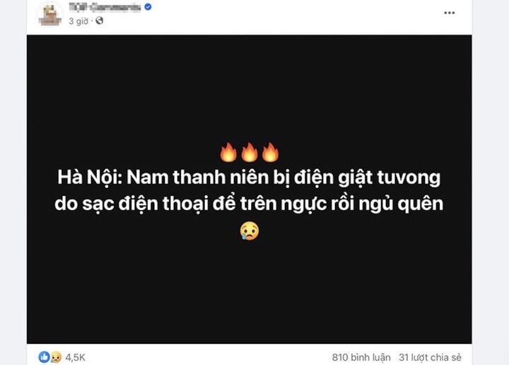 Ngày 18/7, mạng xã hội lan truyền thông tin kèm hình ảnh cho rằng một thanh niên ở phường Đồng Mai (quận Hà Đông, Hà Nội) bị điện giật tử vong do để điện thoại đang sạc trên ngực rồi nằm ngủ.