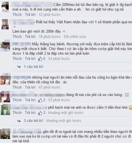 Phẫn nộ với tên cướp, facebooker Tuỳ Duyên nói: “Những loại người ăn trên nỗi đau của người khác cũng không bao giờ khá lên được đâu. Của thiên rồi cũng trả địa”.