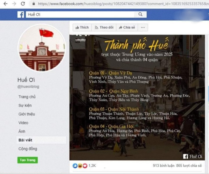 Mới đây, trên mạng xã hội Facebook tại Thừa Thiên - Huế lan truyền thông tin thành phố Huế trực thuộc Trung ương vào năm 2025 và được chia thành 4 quận bao gồm, quận 1 - quận Vỹ Dạ, quận 2 - quận Ngự Bình, quận 3 - quận Nội Thành và quận 4 - quận Gia Hội.