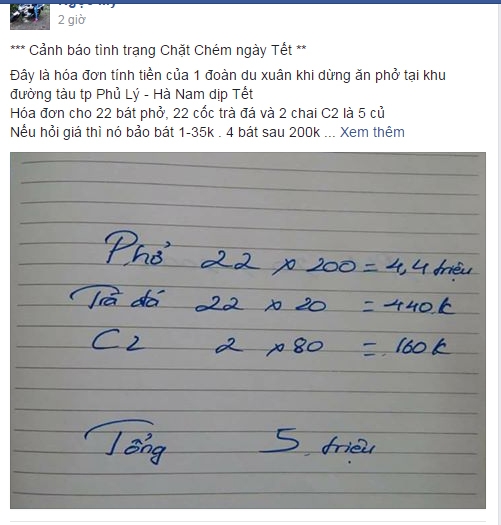Theo đó, ngày (31.1), thành viên "A.T" chia sẻ, một đoàn du khách dừng ăn phở tại khu đường tàu TP. Phủ Lý dịp Tết kèm theo một tờ giấy gọi là "hóa đơn" ghi giá thanh toán 22 bát phở, 22 cốc trà đá và 2 chai nước ngọt với tổng cộng số tiền 5 triệu đồng. Theo cách tính ghi trên tờ "hóa đơn", 22 bát phở có giá 4,4 triệu đồng, tính ra 200 nghìn/bát; 22 cốc trà đá giá 440 nghìn, tức 20 nghìn cốc; còn 2 chai C2 có giá 160 nghìn, tức 80 nghìn/ cốc.