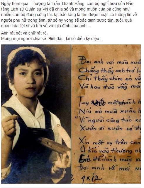 Trong những giờ qua, bức ảnh một người con gái và bài thơ “Đợi anh về” chép tay ở đằng sau đang được cư dân mạng chia sẻ rầm rộ với lời kêu gọi tìm cô gái trong ảnh với hi vọng biết được tên, tuổi, gia đình của liệt sĩ.