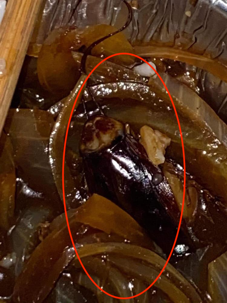 Trong hộp cơm bò sốt tiêu, bò đâu thì chưa thấy mà xuất hiện một "tiểu cường" ngay giữa phần ăn. Thậm chí, con gián này còn có cỡ lớn, nằm gọn trong phần sốt tiêu kèm hành tây.